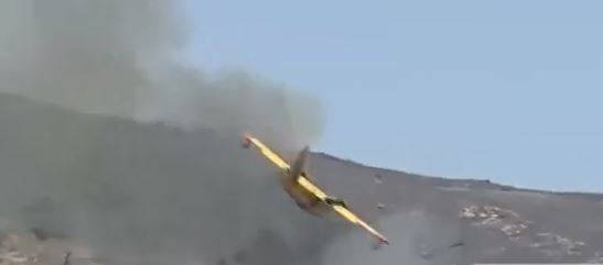 На видеото емитувано на грчката државна телевизија ЕРТ се гледа светло жолтото летало како го ослободува товарот со вода пред неговото крилото да се заглави во гранка од дрво. Неколку моменти подоцна се заби во земјата и изби огнена топка.