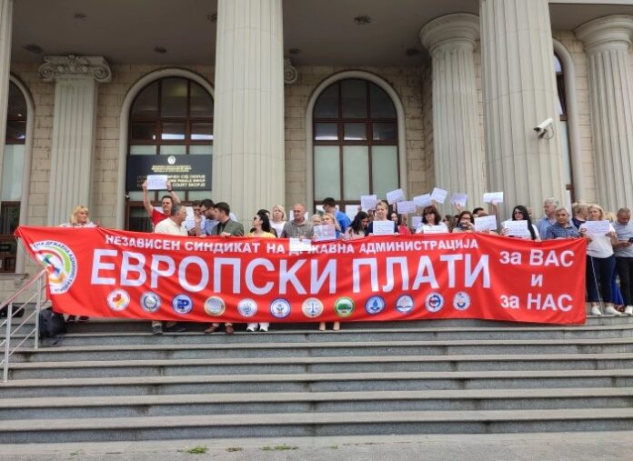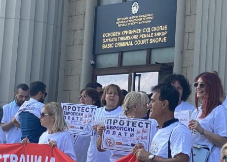 Co свирчиња песната „Бела, чао“ и транспарент „Европски плати за вас и за нас“ судската администрација пред Кривичниот суд во Скопје бара да им се вратат додатоците на плата укинати со истиот член кој им овозможи зголемување на платите на избраните и именуваните лица од 78%, бараат нов закон за независен судски буџет и нов закон за судска служба. Откако министерот за финансии Фатмир Бесими вчера не им го потпиша одобреното покачување од 15 %. За додатоци на плата.