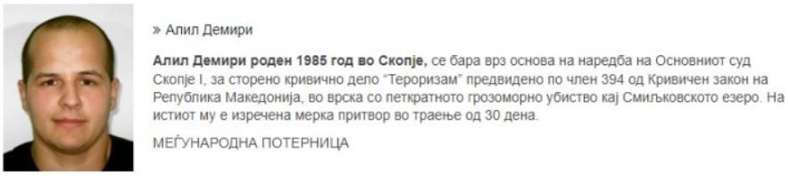- Денеска (24.08.2023) полицијата на Република Косово, во соработка со македонската полиција, во Косово го лиши од слобода Алил Демири (38) врз основа на издадена меѓународна потерница од МВР на РСМ, баран врз основа на наредба на Oсновниот суд Скопје 1, за сторено кривично дело “Тероризам” предвидено по член 394 од Кривичен закон, во врска со петкратното грозоморно убиство кај Смиљковското езеро., велат од МВР